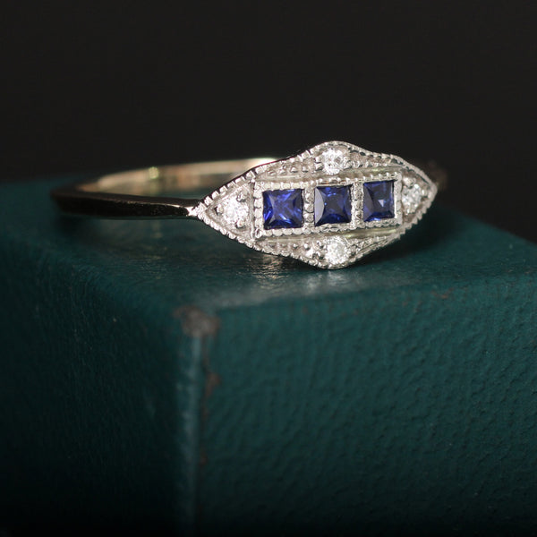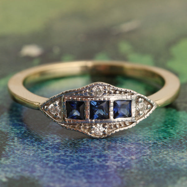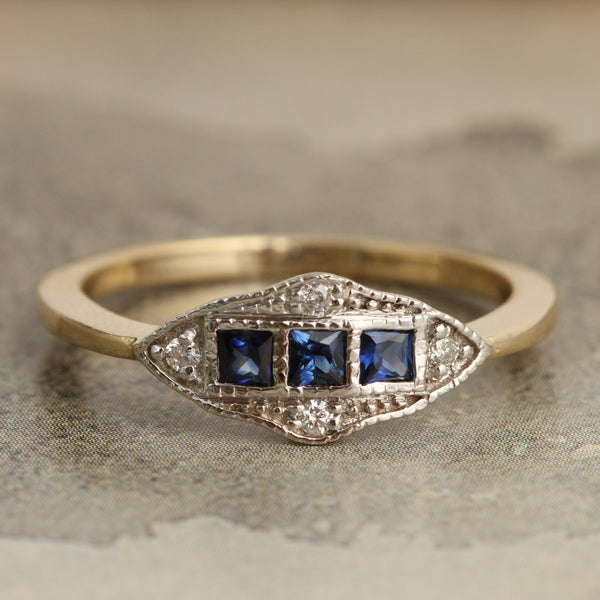 - Materials: 14k white gold setting. 14k yellow gold band. Three square cut sapphires total .25ctw. Four diamond chips.