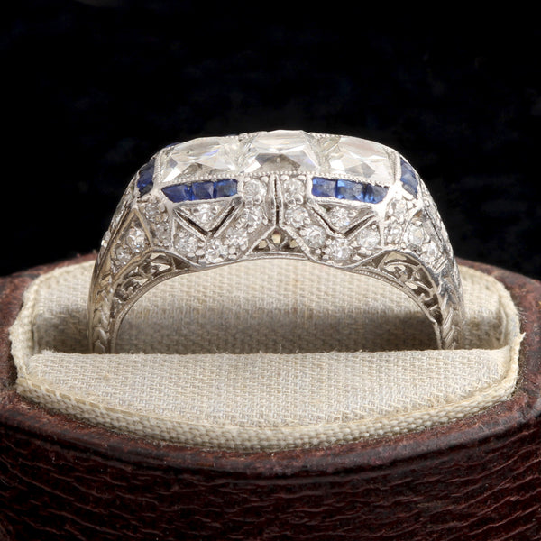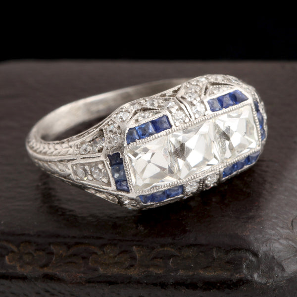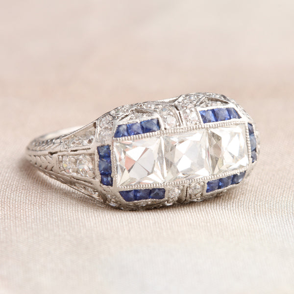 ((about))The three stone style of this Deco engagement ring is known as a trilogy ring. Trilogy rings have three primary stones which represent the past, present and future. We've seen many beautiful trilogy rings come and go, but never one quite as distinctive as this one. Crafted in platinum, the face of the ring features three .50ct French cut diamonds bookended with calibré cut sapphires. The square shoulders and zig zag of the gallery are encrusted with a total of 44 old European cut diamonds (.75ctw) and the entirety of the hoop is engraved with a wheat motif. Spectacular.