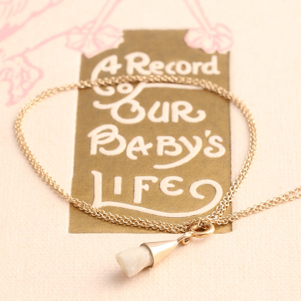 ((inspiration))Before antibiotics, when maternal and pediatric medicine meant many babies didn't survive infancy, the loss of a first tooth was a celebratory moment. It means they'd passed those critical first months without disaster, and their survival rate increased dramatically after that. The sentimental Georgians and Victorians often took these "milk teeth", as they were called then, and set them into joyful jewelry. What more personal souvenir could exist? Before you could scroll through a zillion photos of your kiddo on your iphone, before photography even was imagined, a milk tooth jewel was a way to keep your baby close to your heart.
