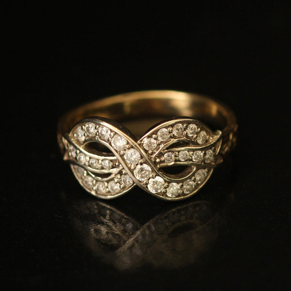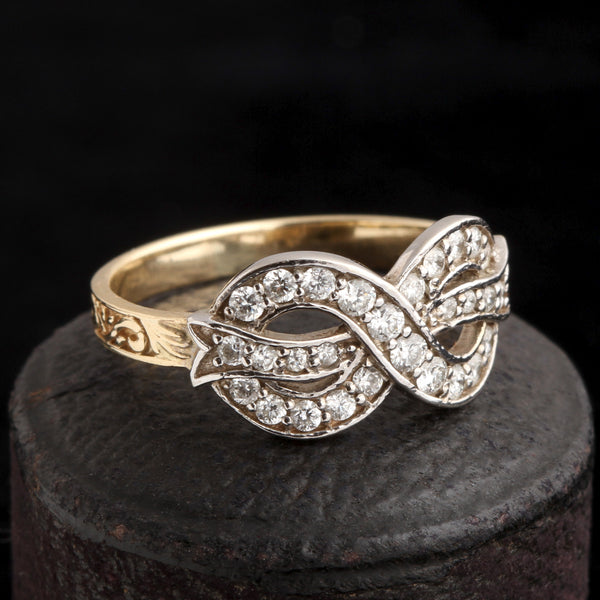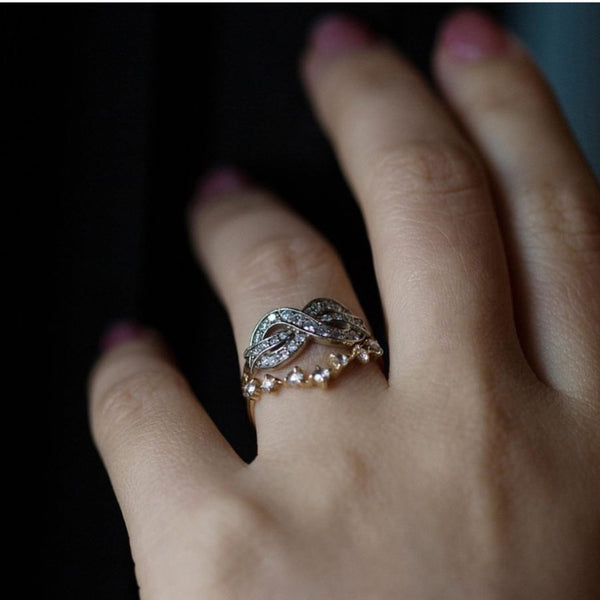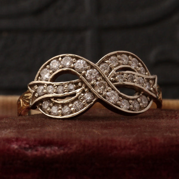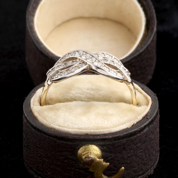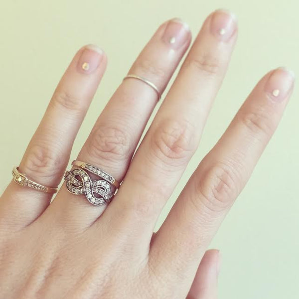 The sentimental Victorians used the "infinity knot" as a tidy metaphor for undying affection: it loops around itself in an eternal twist, forever and ever, never beginning and never ending. In a time when lovers were often parted for long periods, it could be a comforting metaphor for intimacy despite being apart. Think about what would happen if you pulled both ends of this bow: the further the distance, the tighter the knot. We use 28 stones to adorn this engagement-worthy diamond bow ring.