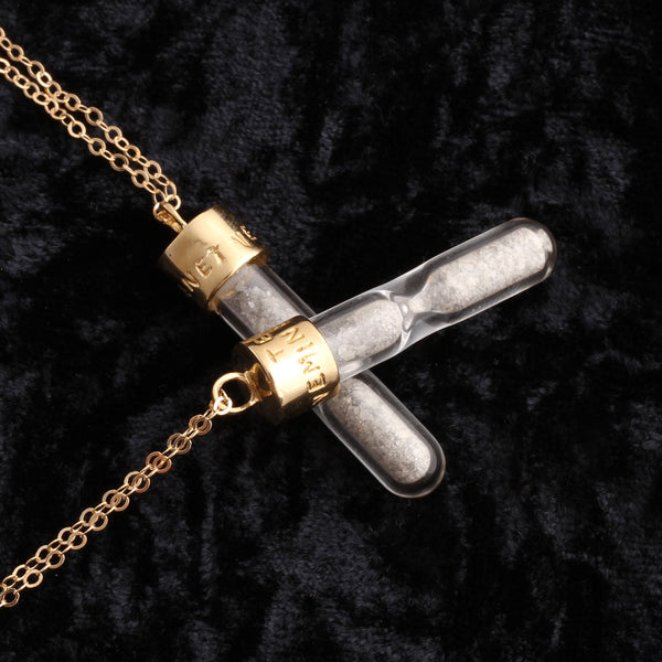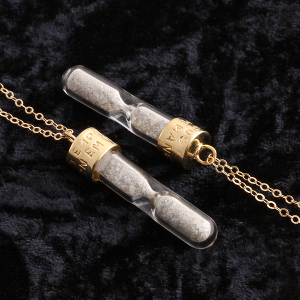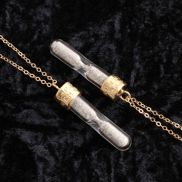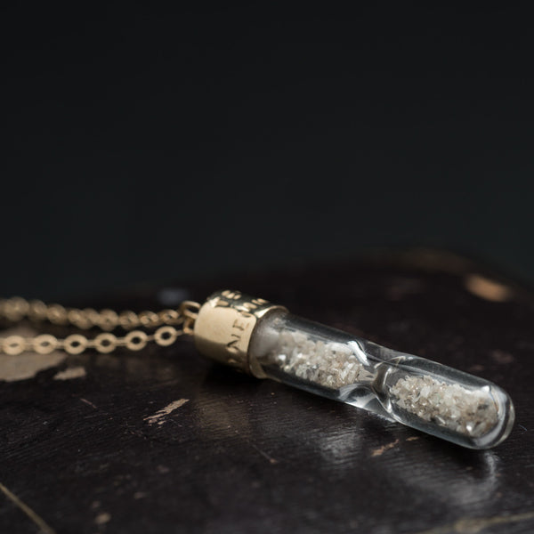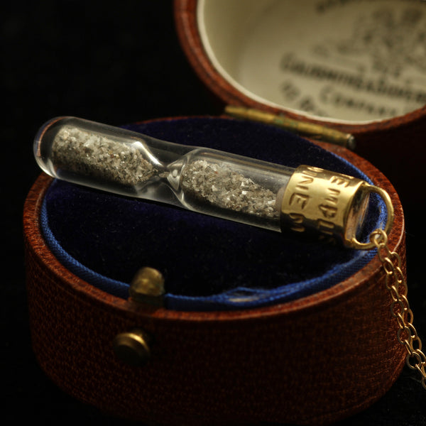((about))An hourglass contains raw diamond dust that moves from one chamber to another. Sometimes you have to give it a little shake to move it along. Don't use this as a timekeeping device, but rather as a reminder to live your life to the fullest. To really drive this point home, we've engraved the cap with the Latin phrase TEMPUS NEMINEM MANET, meaning "time waits for no one".