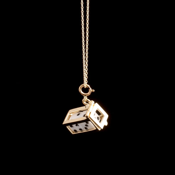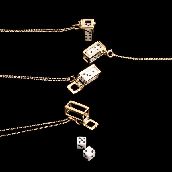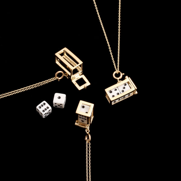 - Materials: 14k gold box, vintage plastic dice, gold fill chain.
