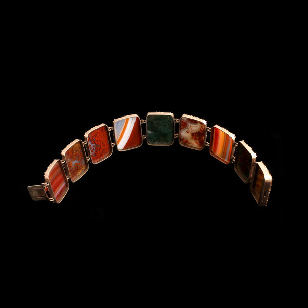 Victorians had a fascination with nature’s variety, and this bracelet captures that impulse. Each panel of this bracelet is set with a polished slab of agate or jasper and each stone is unique. These were known as specimen stones, chosen not for uniformity but for their unique patterns and palette. Set in 10k gold with a concealed clasp, this piece reflects a 19th-century love of collecting, classifying, and celebrating natural wonders.