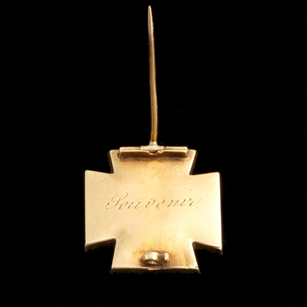 The Maltese cross is an old, powerful symbol. Throughout its long history, the design has represented truth, faith, justice and mercy. This early Victorian brooch is modeled in the shape of a Maltese cross with hairwork beneath rock crystal and a pearl border. The reverse side is engraved “Souvenir”.