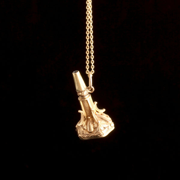 This early 19th century fob was designed to hang from a gentleman’s watch chain or a lady’s chatelaine. This multi-functional piece is both a watch key and seal. The base of the fob is set with an amethyst intaglio cipher of the letter “L”.