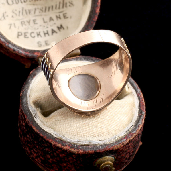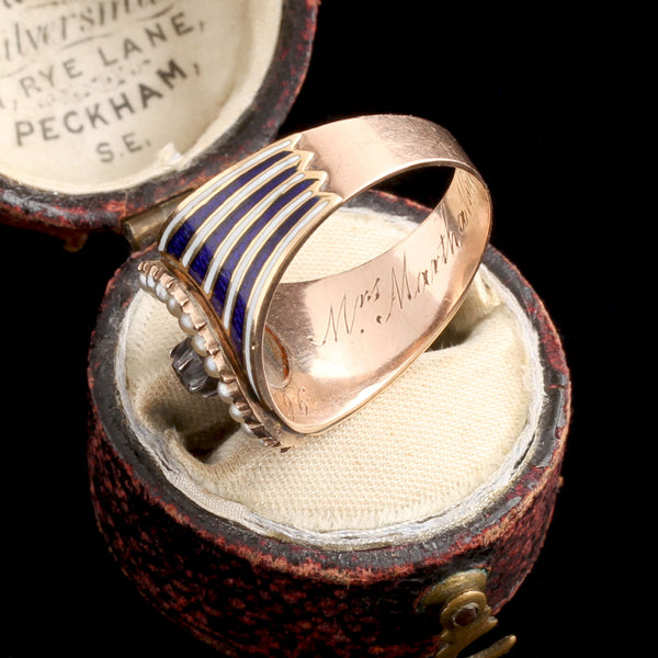 We don't see mourning rings of this quality much. Extra-fancy blue and white enamel stripes frame a diamond and pearls; the locket in the back holds the hair of the celebrated "Mrs Martha Wormald Obit 11 Oct AEt at 50" engraved around hair locket. She died in 1796 with quite a bit of money. Memorial rings like this were given out in multiples to friends and family of the deceased, and only the richest members of society could afford put diamonds on them.