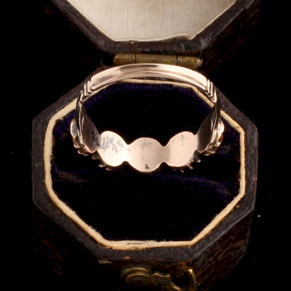 A Georgian five stone ring fashioned in gold and set with a quintet of coral cabochons. The stones are set in the crimped, closed settings classic to the period and finished with forked shoulders and a subtly dished hoop. Simple and lovely.