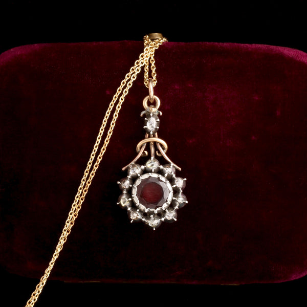 MATERIALS: 10k gold (tests), silver, 6.2mm flat cut round garnet, 11 rose cut garnets (10 2mm, 1 2.5mm), new 14k gold chain