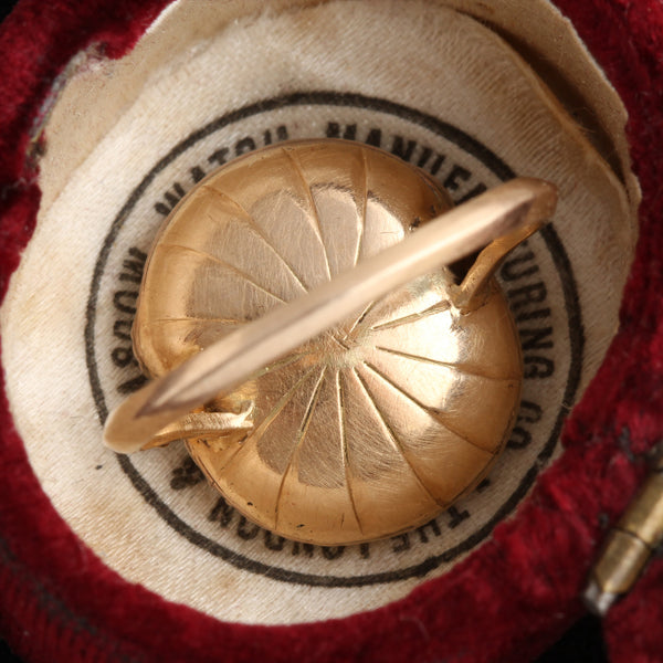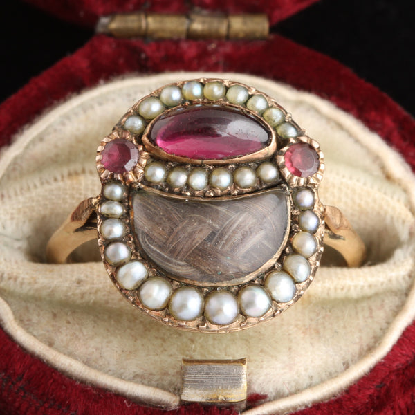 This wonderful Georgian ring is made in the unusual shape of a padlock, it's lines are articulated with seed pearls of graduated sizes punctuated with almandine garnets. The upper portion of the lock features a lovely oblong garnet cabochon and the lower portion holds a locket set with a braided lock of hair. Note the lovely engraving on the underside of the head. Rare and very special.