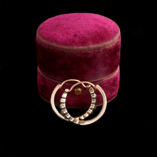 A just about perfect pair of minimal Georgian hoops modeled in gold and silver and set with graduated white pastes.