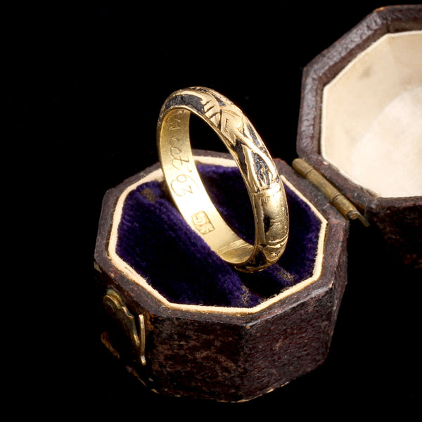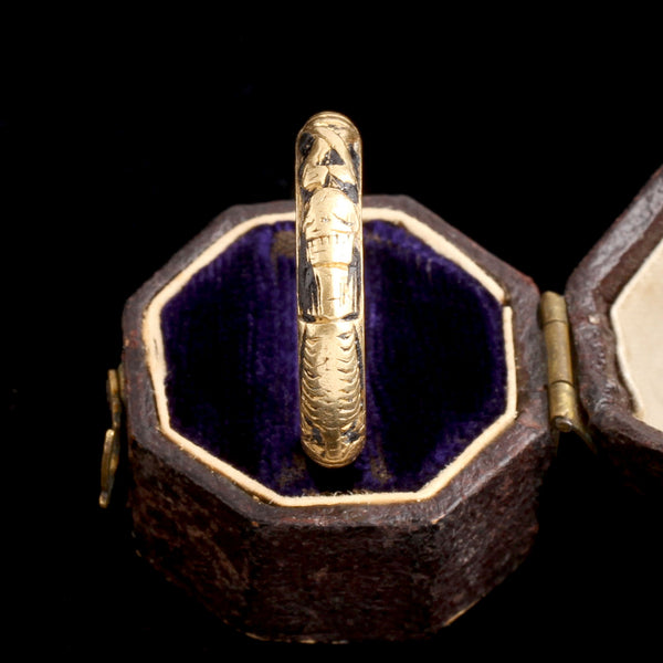 These extremely rare bands are called "skeletals" - the first example dates from 1659, and this one was made not long after in 1731. A full skeleton and other death-themed emblems are meant to drive home the brevity of life. An hourglass represents time passing, and gravedigger's tools are a poignant memento mori symbol. There's significant loss to the black enamel, which we actually like, because it means that you can truly wear this ring (if you're a size 8.5, that is - it cannot be resized.)  A perfect example with intact enamel would be unwearable without great care. This one? I mean, it is a treasure, but go ahead and stack it. A similar one (in pristine condition) has been deaccessioned by the Museum of London and is available from the venerable Symbolic & Chase; another example can be found in the British Museum. I cannot overstate how few of these are in circulation.