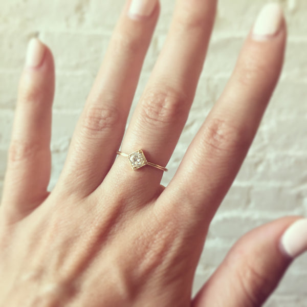 ((about))This perfectly elegant engagement ring was inspired by the Gilded Age, a period in American history that was characterized by rapid industrialization and streamlined style. For our ring's gold setting, we borrowed some of the stylistic elements from the Gilded Age - clean straight lines, a hint of milgrain - and added an antique .40 carat old European cut diamond that would have been a popular cut at this point in history. The low, flat profile is a modern improvement designed for maximum comfort; we've created this ring for a women who will likely be working with her hands.