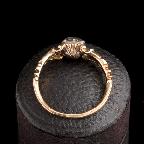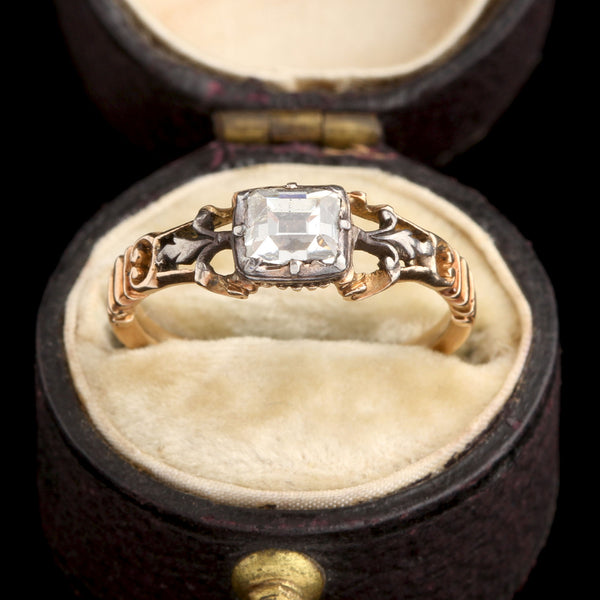 This ring was made and worn right after the American Revolution had been fought. As a country, the United States was beginning to optimistically plan for a democratic society. Back in England (where our ring was) the industrial revolution was churning and the British empire was expanding. Earlier in the 1700s diamonds had been discovered in Brazil - before that, they had only been found in India. Our stone may have come from either place. It's a table cut, one of the simplest modifications that can be made to a diamond. The naturally occurring octahedron shape has it's top point cut off, like a table. Early, rare, outstanding.