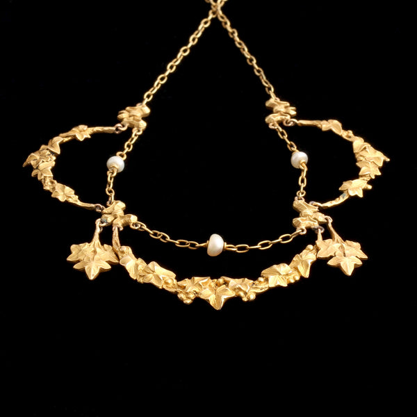 In the Victorian language of flowers, Ivy - a clinging vine - is the floral equivalent of a long, warm hug. Ivy's evergreen nature, thriving even in darkness, represents immortality and long life. This heavy necklace is stamped with French hallmarks. The swag elements are solid and substantial.