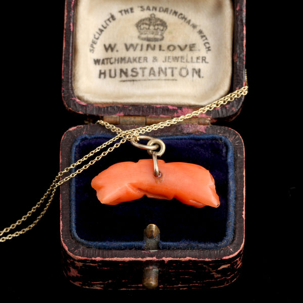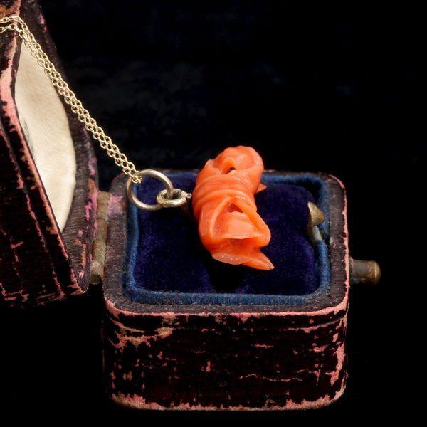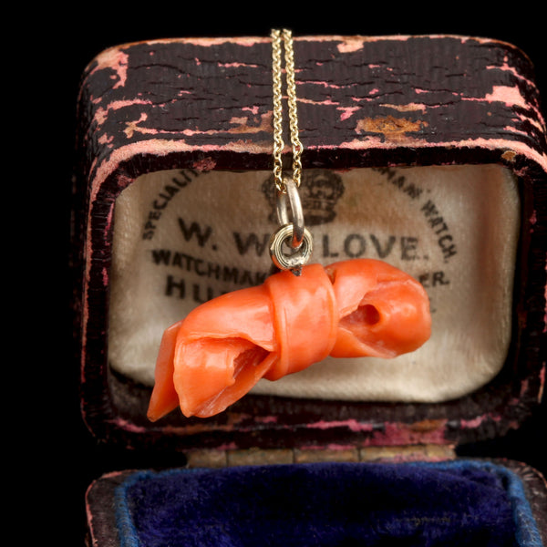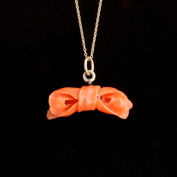 The Grand Tour was an essential undertaking for any English man of means beginning in the 1700s, but it wasn't until the early 1800s with the invention of steam-powered transportation that it became a pursuit open to anyone, including women. The tour typically began in Dover, England and though there was no specified order of countries to visit, most travelers went to France, Germany, and Switzerland before the culmination of the trip in Italy. Throughout the tour one was supposed to acquire knowledge of language, politics, sport and art and become a generally more well-rounded person of privilege. And on the way, they shopped for souvenirs, often in jewelry form. Coral has been popular in jewelry in the Italian region since the Roman era (the ancient Romans believed wearing it could cure sterility!). Italian jewelry-carvers used this medium to create cameos and miniatures like this unusually lovely bow pendant. These clues tell us that most likely, this piece was a souvenir purchased on someone's Italian leg of the Grand Tour in the mid-1800s.