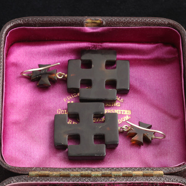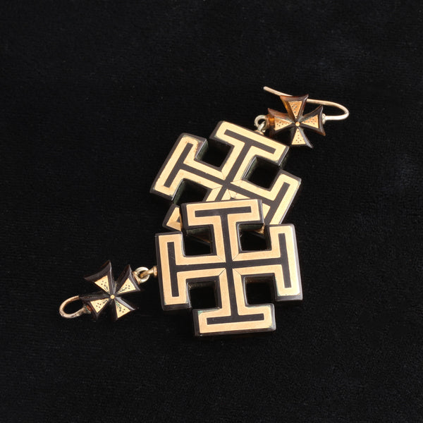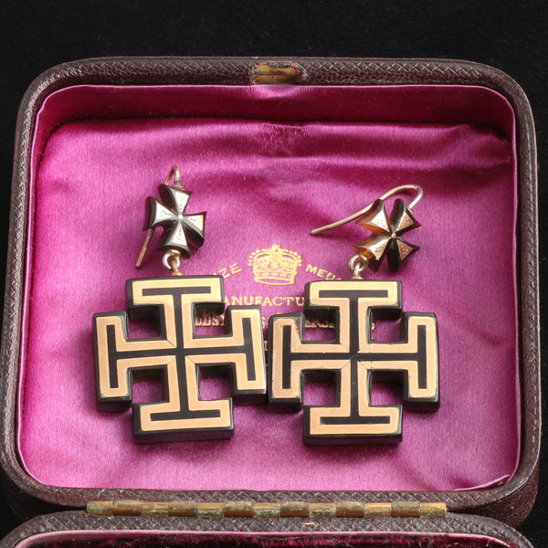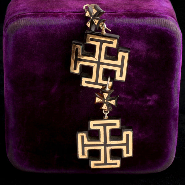 These dramatic, bold Victorian earrings feature heraldic crosses (Maltese and Jerusalem crosses to be specific) fashioned from pique incised with gold. In near perfect condition.