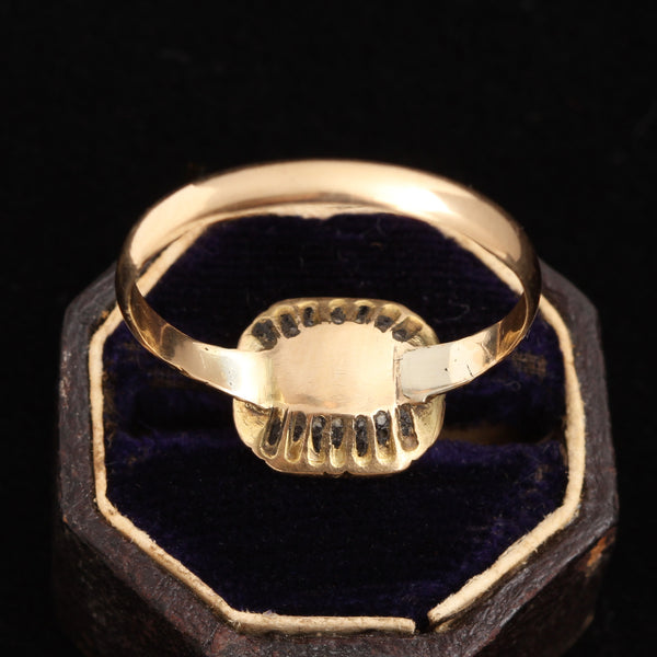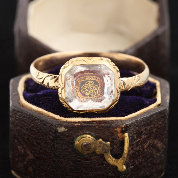 Stuart crystals are faceted rock quartz crystal jewels which originated as a form of mourning (or protest) jewelry after the execution of King Charles I of the House of Stuart in 1649. The first Stuart crystals were pendants or rings and featured the initials of the king or a miniature portrait of him under a rock crystal top. Later variations included cufflinks, buttons, earrings, and slides in addition to the original pendants and rings. Some of these later versions, like this lovely ring, feature initials within a lacy frame of gold thread over a ground of fine hair work and foil. The underside of the head features the fluted detailing frequently seen in Stuart era jewelry and has retained most of its original enamel.