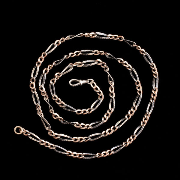 Niello is a black metallic alloy sometimes mistaken for black enamel. Offering similar feel and function as traditional enamel, the dark material has been used to decorate jewelry since the days of Ancient Egypt. This late Victorian piece oozes with the sort of understated, yet edgy vibe inherent in many niello adorned jewels. The 28" chain’s stunning, oversized silver links and clasp have been cut and filled with the metallic black pigment and alternate with warm, gold links. The result is a chic striped pattern surrounded by a blend of gorgeously contrasting tones.