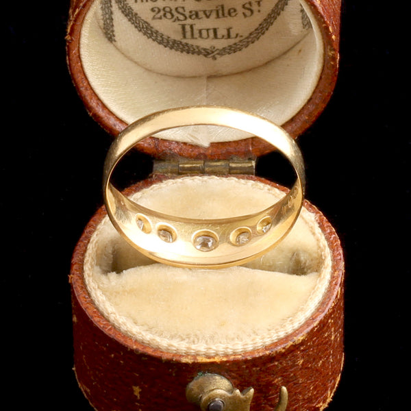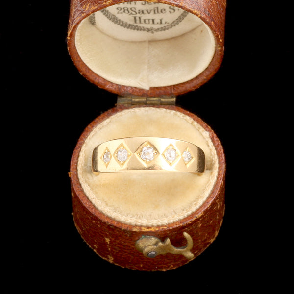 MATERIALS: 18k gold (marked), 5 old mine cut diamonds (.03ct, .04ct, .06ct, .04ct, .03ct)