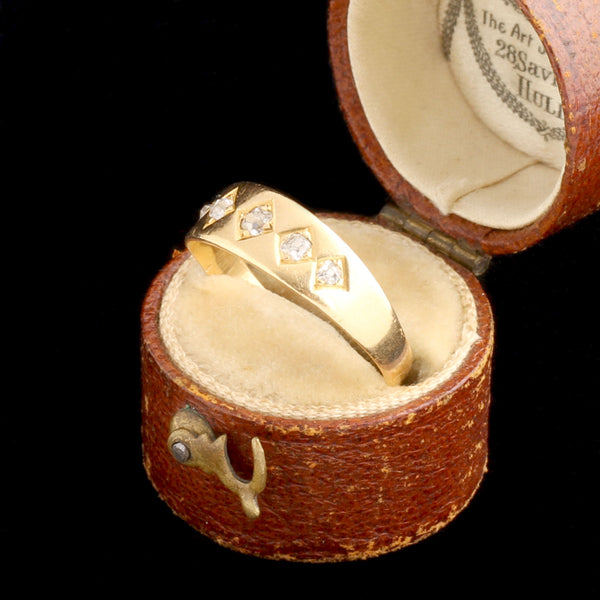 Chubby old mine cuts (also called cushion cuts) truly do look like squared-off pillows. They're lined up in an 18k gold band in diamond-shaped settings that make the stones appear to float. A sweet mirroring of four-pointed shapes c. 1870.