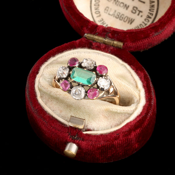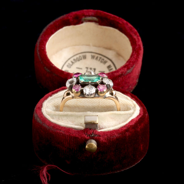 Hell of a Christmas-colored cluster ring. Old mine cut diamonds and four antique rubies create a halo around a verdant .34ct emerald. Made around 1850, possibly as a holiday gift, but more likely as a token of love and object of beauty.