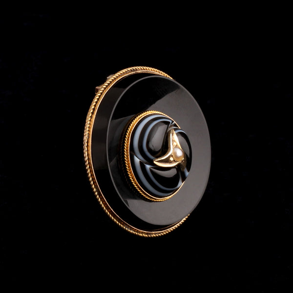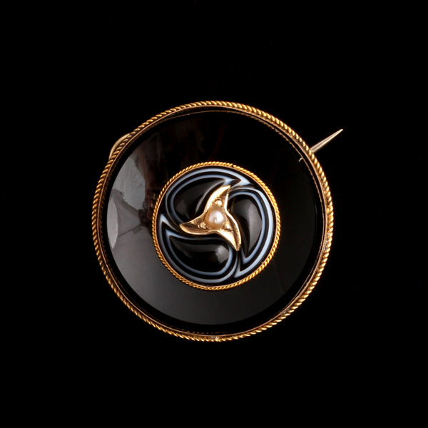 MATERIALS: 14k gold (tests), black onyx, fancy teardrop layered onyx cabochons, 3.2mm pearl, glass lens, new 14k gold chain