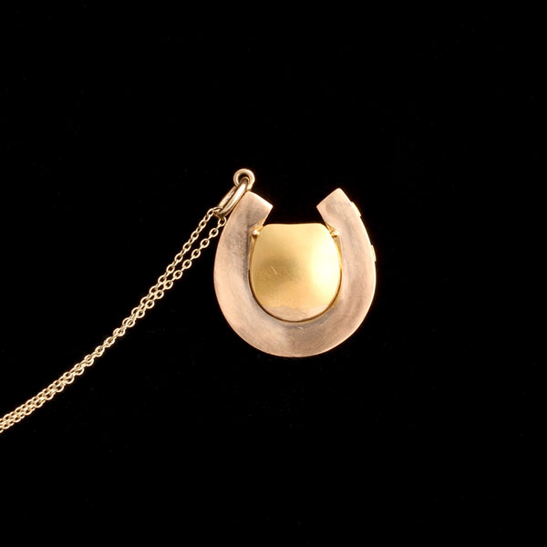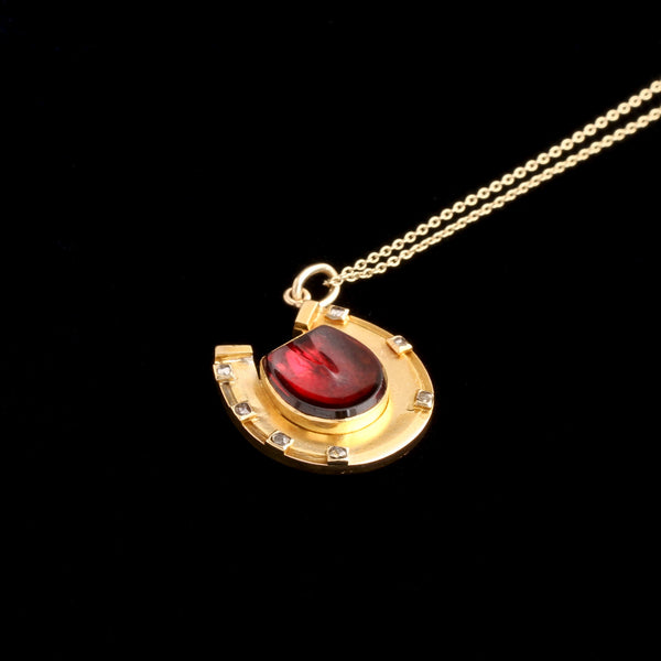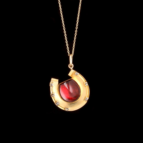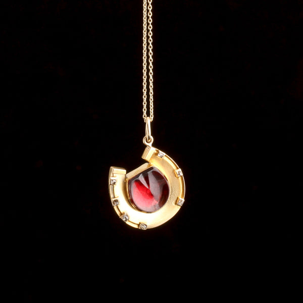 HUMANS HAVE CARRIED and worn lucky charms forever. Although the 19th and 20th centuries were thought to be ages of reason and science (and definitely not superstition) people still kept horseshoes close, just in case. Iron was believed to guard against trouble, so full-size shoes were nailed above doorways. The crescent shape also reached back to much older, pre-Christian lunar goddesses of protection. Here, a glowing garnet is carved to resemble the "frog", a part of the horse's foot. Diamonds (lucky 7!) amplify the good fortune; they're rose cuts in square settings. MATERIALS: 14k gold (tests), carved garnet, 7 1mm rose cut diamonds, new 14k gold chain