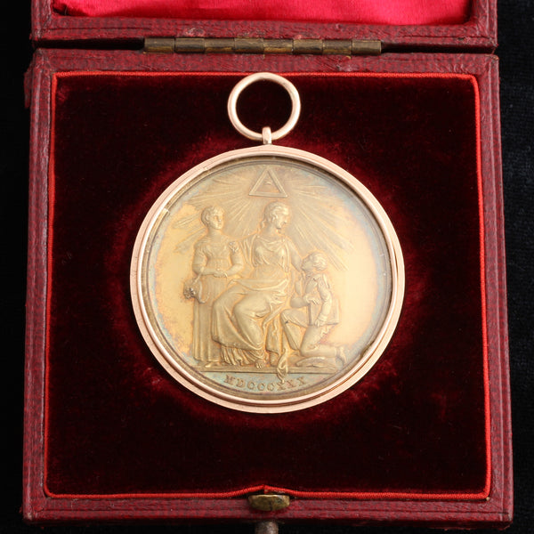 Augustus Frederick, Duke of Sussex and favorite uncle of Queen Victoria, was Grand Master of the United Grand Lodge of England, the governing body of Freemasonry in both England and Wales. This medal, an award for service, was presented only a few years after his death in 1843. The front of the medallion features a seated woman with her arms around a young boy and girl beneath the symbol of the all seeing eye. The obverse reads: "Honorable Testimonial of Masonic Charity & Benevolence Instituted by H:R:H: Aug[ustus] Fed[erick] Duke of Sussex M: W: Grand Master". The medal is fitted in gold and engraved along the outer edge, "Brother Pierre Moret Served as Steward to the Girls Charity 1847, to the Boys Charity 1848". The Royal Masonic Trust for Girls and Boys still exists to this day with the purported aims of relieving poverty and advancing education for children and young people. Originally, this piece would have been suspended from a ribbon and ceremonially pinned to a lapel.