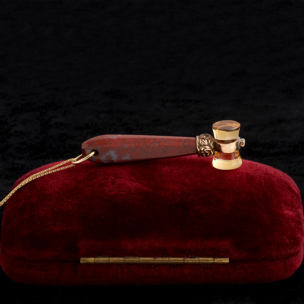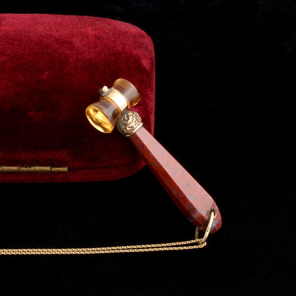 “Gavel” comes from an Old English term “gafol” which meant “rent” or “tribute” given to landlords. Specifically, in Medieval England, if a person had no money to pay a land owner, the person could go to “land-court” and offer livestock or grain as payment. If the court found the items of equal value to the rent owed, a hammer strike sounded to show rent had been paid via the non-monetary item. Jasper and citrine, c. 1860.