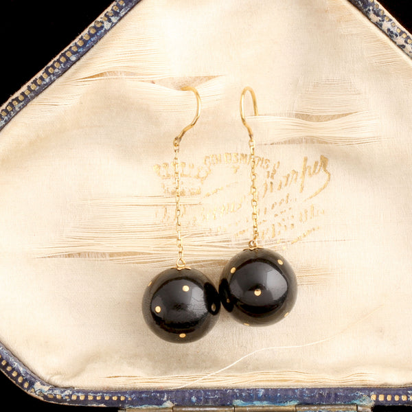 The tiny dots - just dots, not swirls or squiggles or flowers or leaves - are made of 18k gold and were pressed into the dark tortoiseshell orbs when the material was heated. Tortoiseshell is an early thermoplastic; making it hot allows it to be shaped, stamped with patterns, or inlaid with precious metals. Here, simplicity shines.