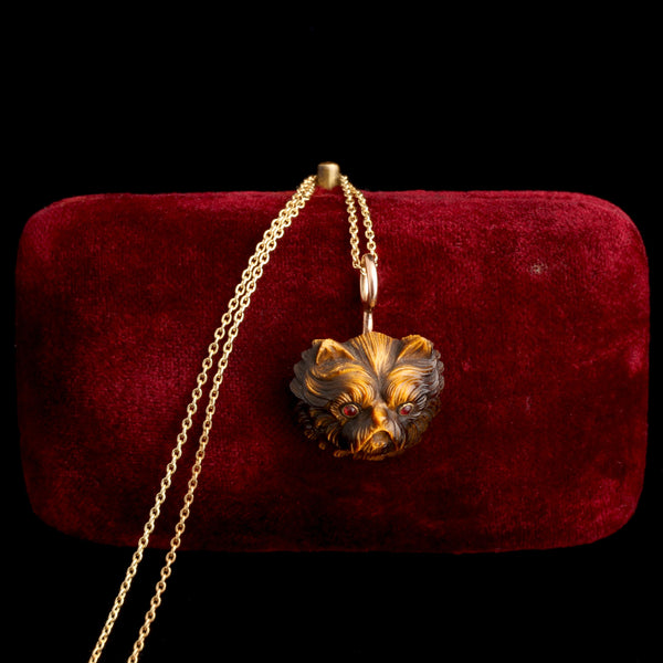 A late Victorian carving of a Pekingese dog is worked in striped tiger’s eye with small garnet cabochon eyes. In the nineteenth century, toy breeds like the Pekingese were closely associated with privilege. They were imported from China in tiny numbers, kept by fashionable women, and acted as visible markers of refinement. Jewelry featuring specific lapdog breeds was part of that culture, usually worn as stickpins or small charms that signaled social standing. The natural bands in the stone give the dog's face warmth and depth.