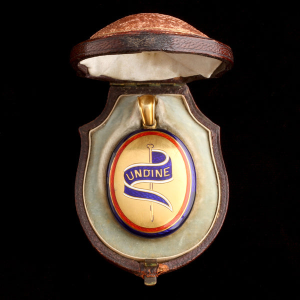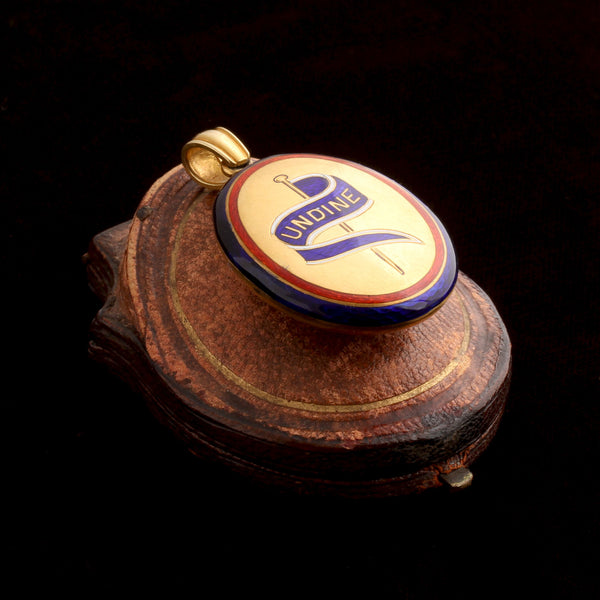 Alchemy was one of the many, many systems that humans invented to try to classify and understand the world. In the 16th century, an alchemist invented Undine - also sometimes spelled "Ondine" - a mermaid-like character associated with water. They were always female, and were known to have beautiful singing voices. Sound familiar? Hans Christian Anderson borrowed from this legend for "The Little Mermaid". On this high-carat locket, we see the water nymph's name along with a flag which almost certainly has significance - Lindsay thinks Undine was the name of a ship. It's in incredible condition, with flawless enamel, an intact glass lens, and the original fitted box which says Page, Keen & Page Goldsmiths Plymouth. This was a major port so they probably specialized in nautical jewelry.