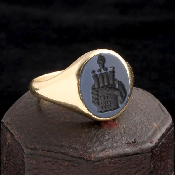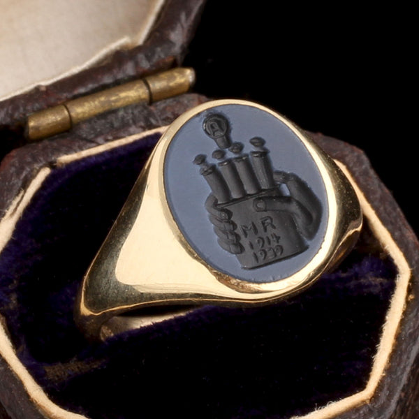 A true mystery. At first glance, doesn't it look like the hand is holding a pack of cigarettes? It's not. Lindsay's almost positive it's an en bloc clip, which re the bullet clips used in the kind of rifles employed in both WW1 and WW2. The dates - 1914 and 1939 - are the years that each of the wars began. The MR could be a military regiment, or maybe someone's initials? And the hallmarks are Dutch. Military historians, help us out! There's a story here for sure.